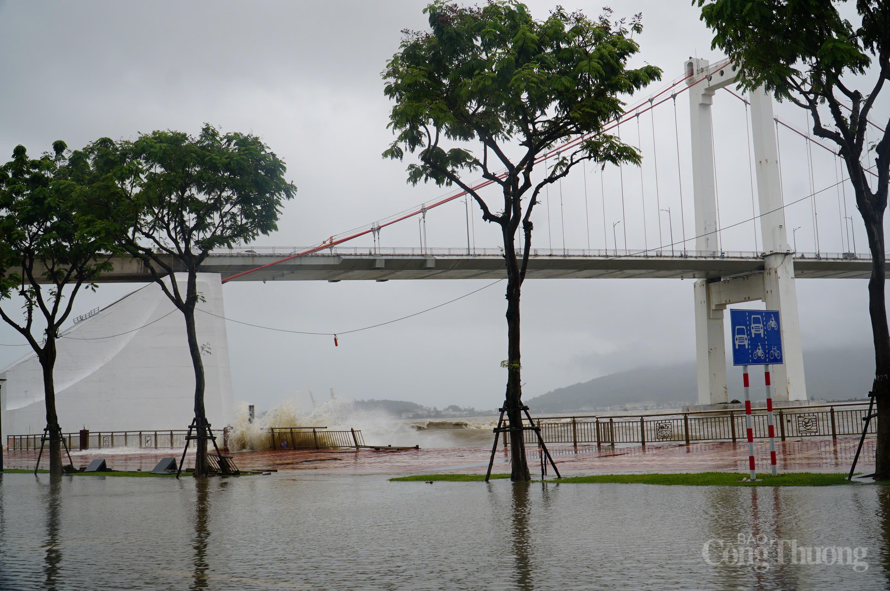 Trưa 23/10, trời vẫn tiếp tục có mưa vừa, ghi nhận tại khu vực này, sóng tới hơn 2m, vẫn liên tục đánh mạnh vào vỉa hè ven sông. Ở khu vực sát chân cầu Thuận Phước, nước sông Hàn dâng cao, tràn vào đường.