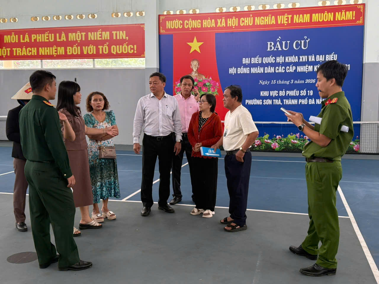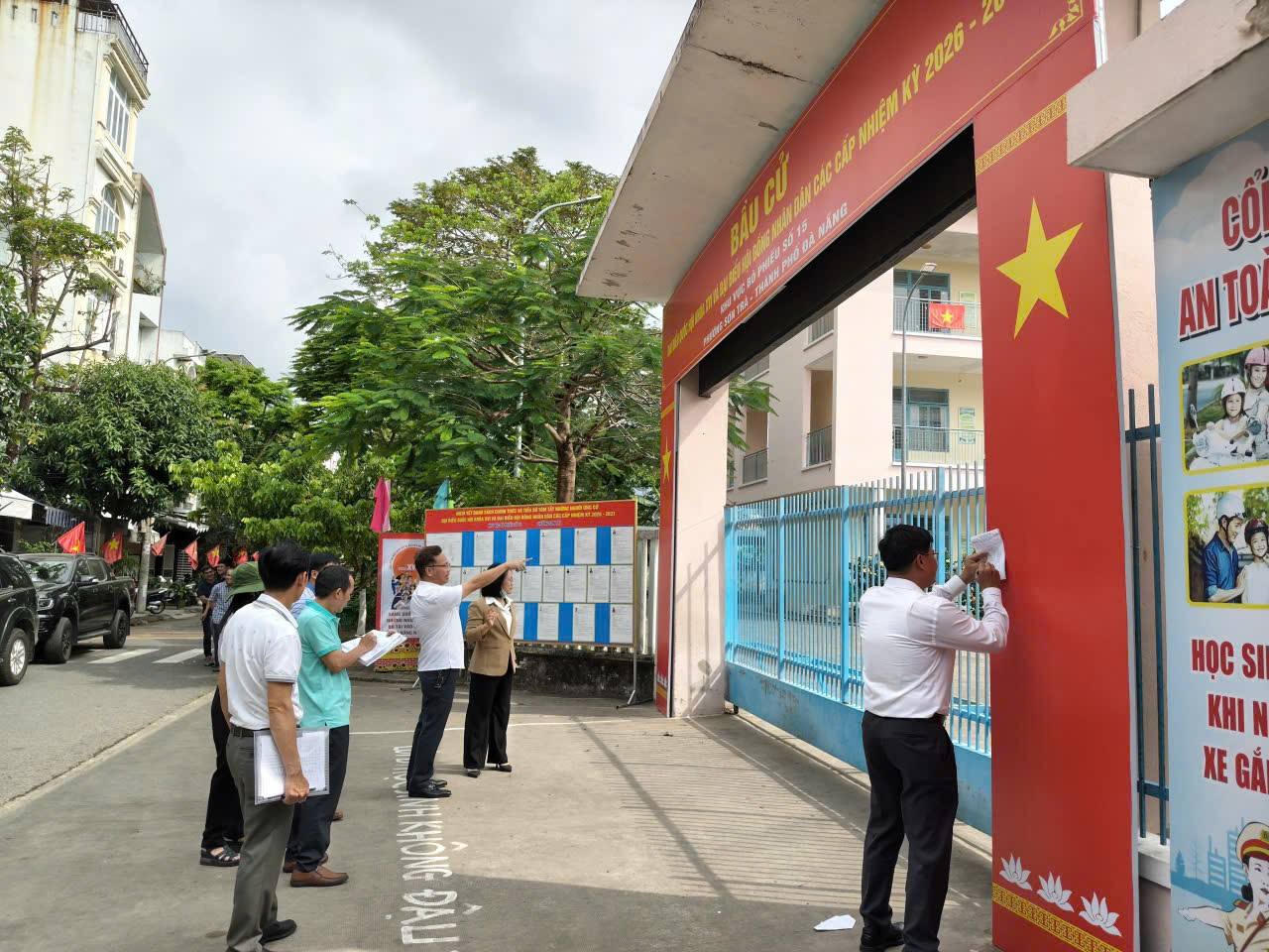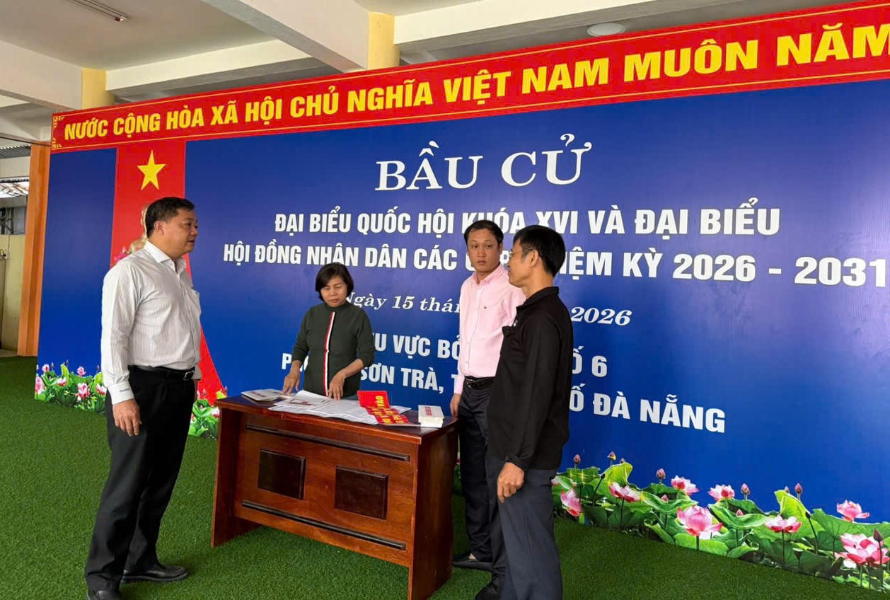 Ông Đinh Vui, Chủ tịch UBND phường Sơn Trà và lãnh đạo đơn vị phường kiểm tra các điểm bầu cử. Ảnh: Nguyễn Tú.