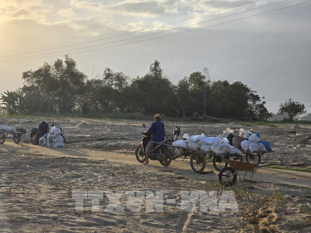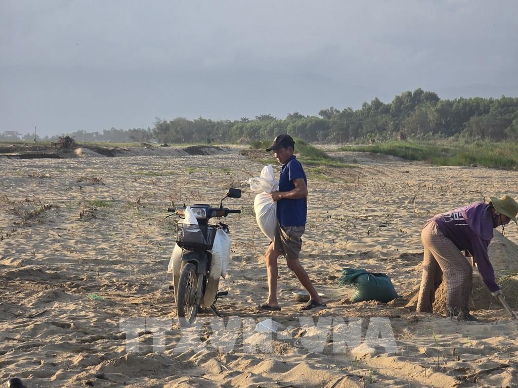 Người dân tại xã Gò Nổi (thành phố Đà Nẵng) tất bật dọn dẹp khi lượng cát đổ về quá lớn và dày, làm chậm trễ mùa vụ. Ảnh: Khoa Chương - TTXVN
