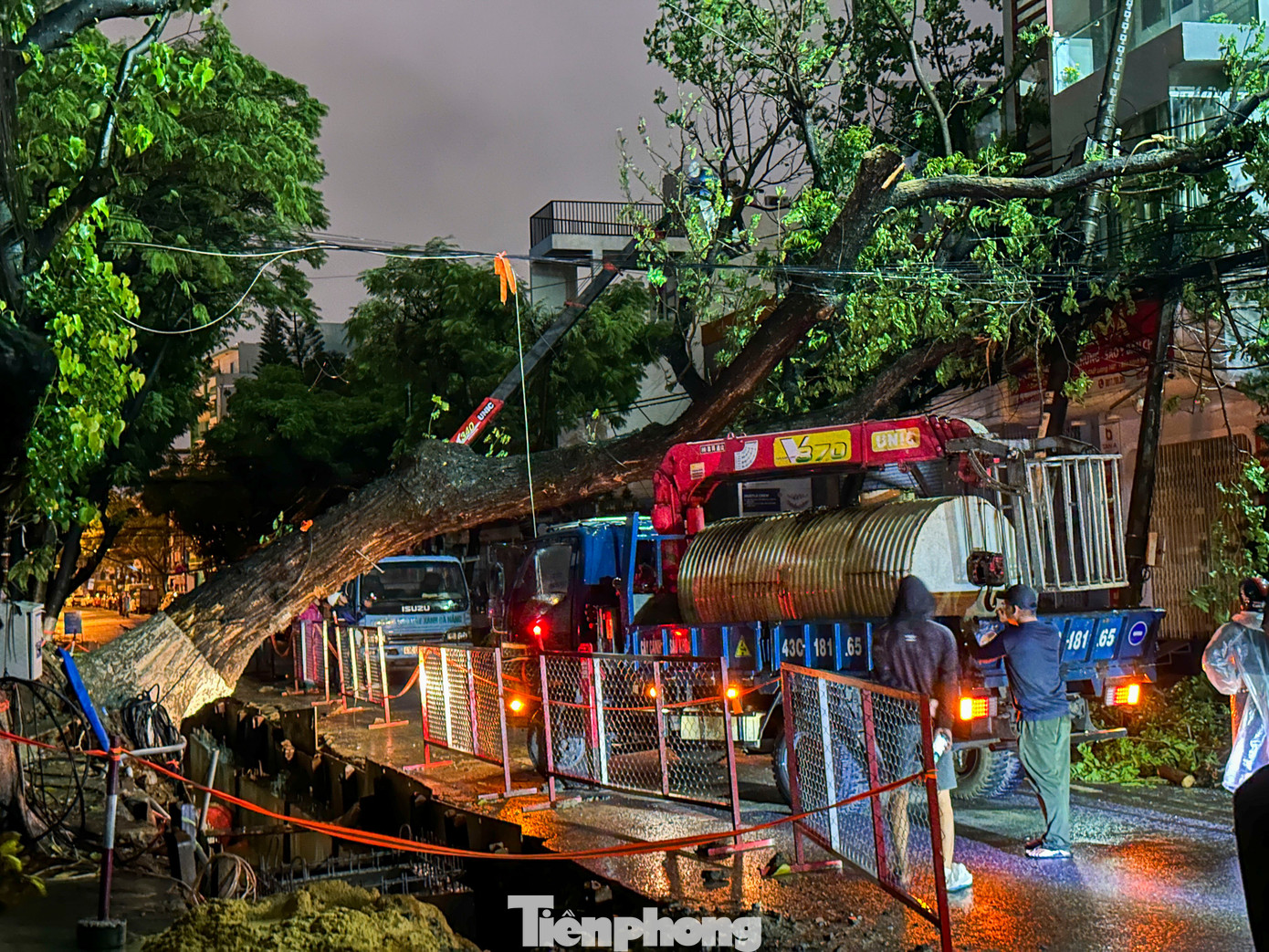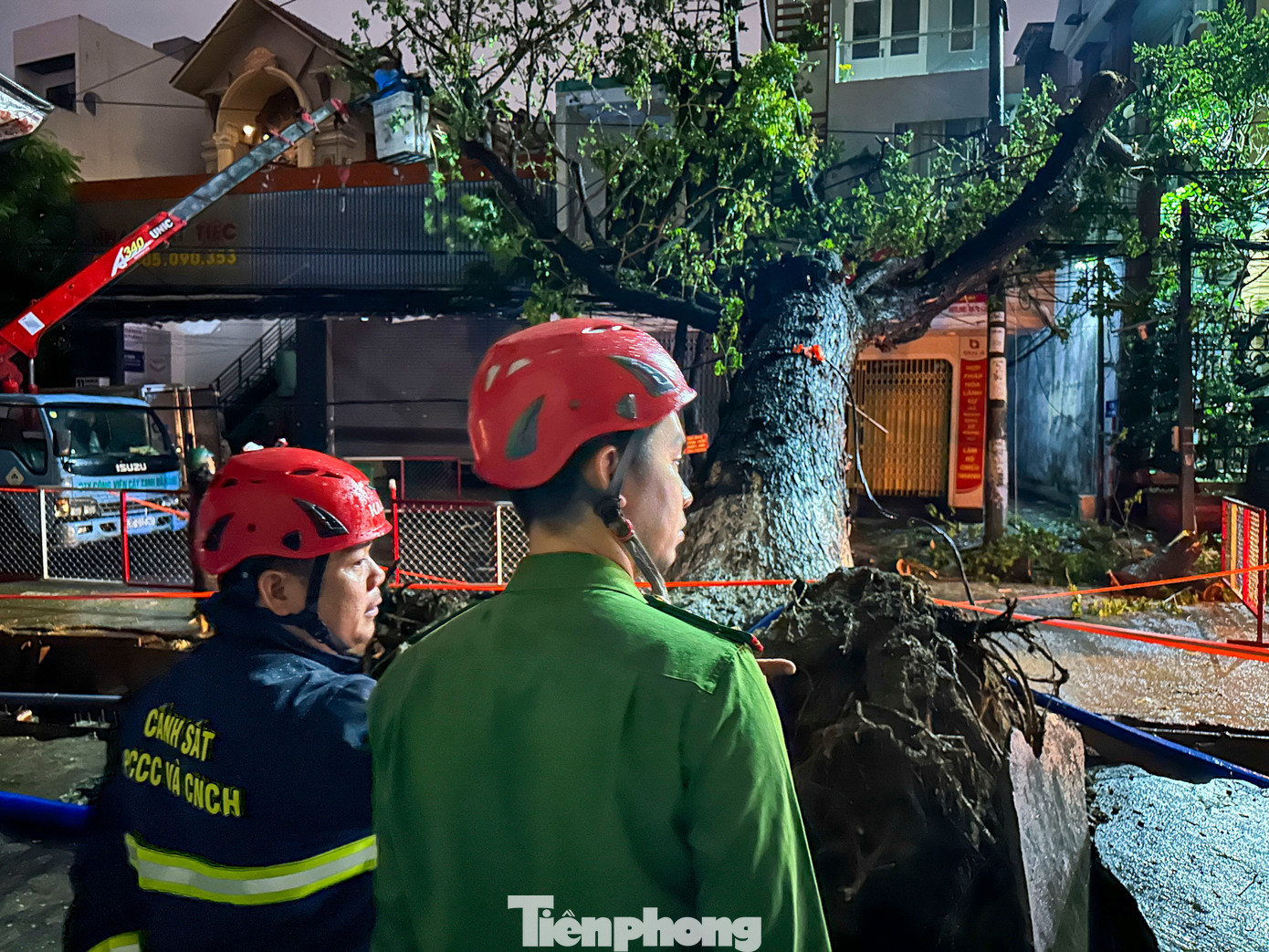 Lực lượng chức năng cũng phối hợp cắt tỉa các nhánh cây lớn, từng bước giải tỏa phần thân cây chắn ngang mặt đường nhằm khôi phục giao thông. Do cây có kích thước lớn nên việc cưa cắt, di dời gặp nhiều khó khăn và mất khá nhiều thời gian.