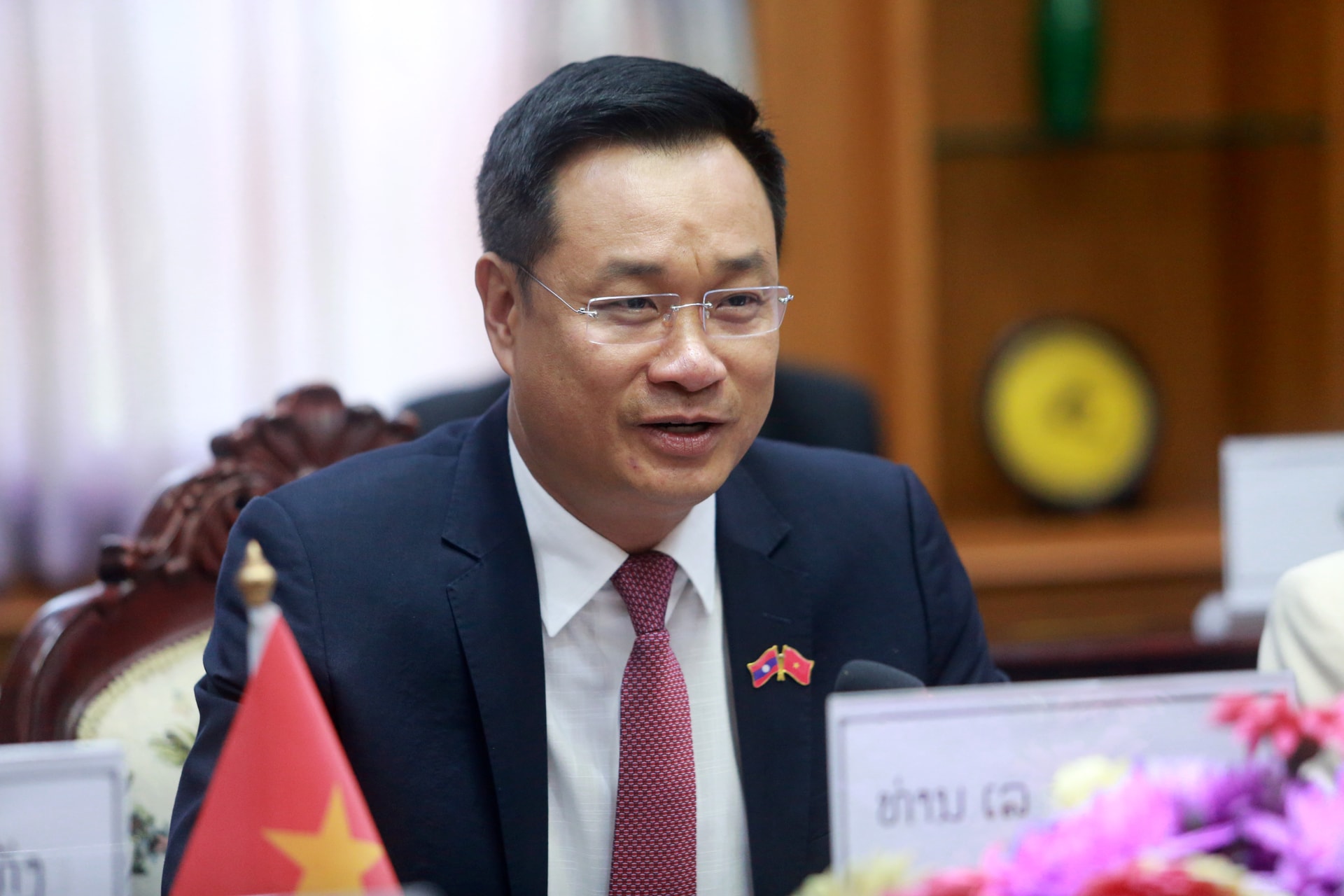 Bí thư Thành ủy Đà Nẵng Lê Ngọc Quang tặng hoa chúc Tết Bunpimay Bí thư Tỉnh ủy Champasak Alunxay Sounnalath. Ảnh: T.CÔNG
