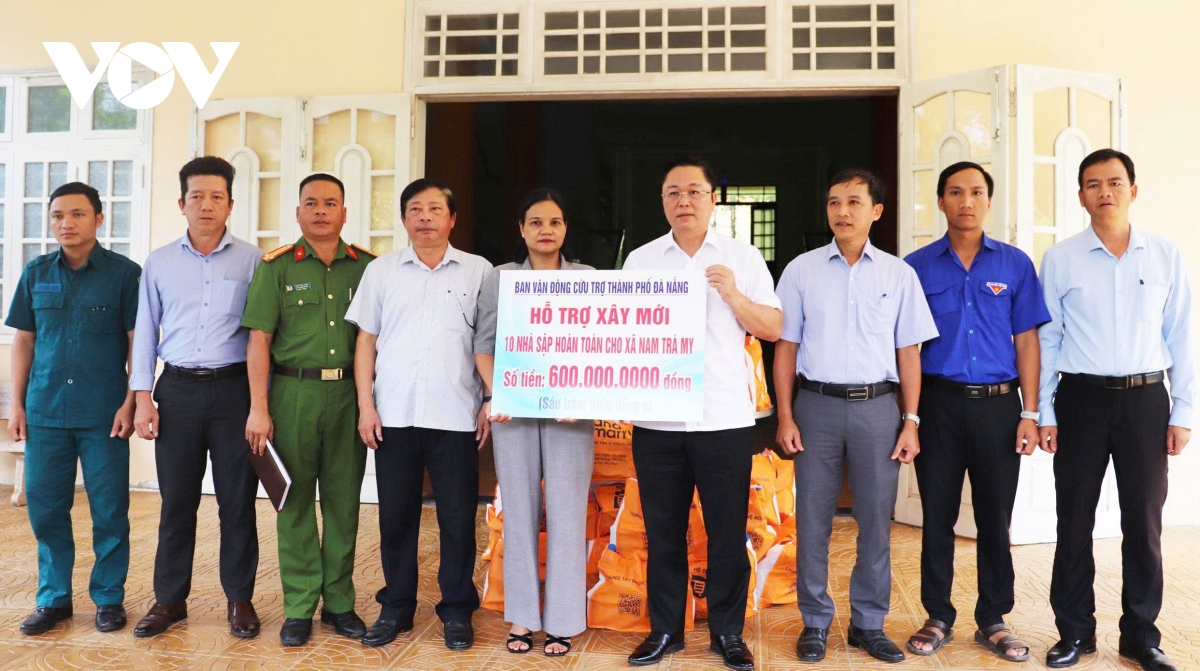 Ông Lê Trí Thanh, Chủ tịch Ủy ban Mặt Trận Tổ Quốc Việt Nam TP Đà Nẵng (thứ 4 từ phải qua) trao kinh phí hỗ trợ làm nhà tặng người dân xã Nam Trà My