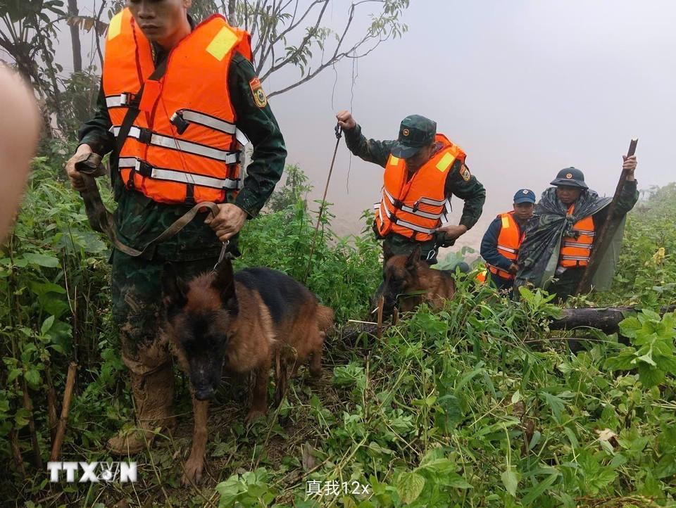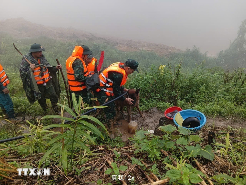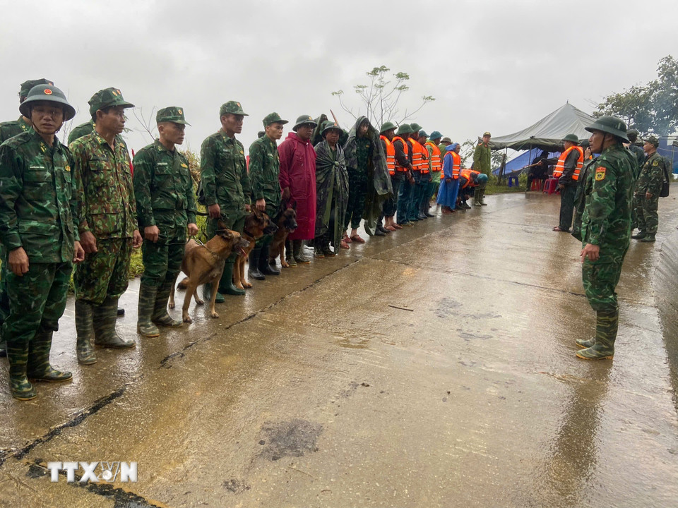 Triển khai lực lượng tìm kiếm nạn nhân mất tích trong vụ sạt lở ở xã biên giới Hùng Sơn với sự hỗ trợ của chó nghiệp vụ. (Ảnh: Bộ Tư lệnh Quân khu 5/TTXVN phát)