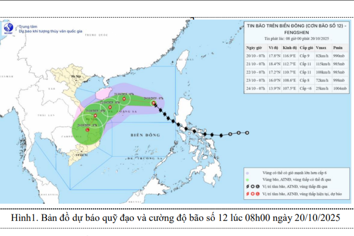 Theo Đài Khí tượng thủy văn Trung Bộ, do ảnh hưởng của bão số 12, khu vực Bắc Biển Đông (bao gồm quần đảo Hoàng Sa) có gió mạnh cấp 7-8, vùng gần tâm bão mạnh cấp 9-11, giật cấp 13; sóng biển cao 3-7m, biển động dữ dội. Từ đêm 22 đến ngày 27/10, khu vực Đà Nẵng có khả năng xảy ra mưa rất to đến đặc biệt to, tổng lượng mưa phổ biến 350-600mm, có nơi trên 800mm; nguy cơ cao xảy ra lốc, sét, mưa đá, gió giật mạnh và lũ trên các sông.