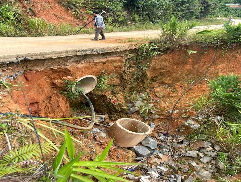 Mưa lũ gây sạt lở tuyến đường độc đạo đi vào trung tâm xã La Êê. Ảnh: CÔNG TÚ
