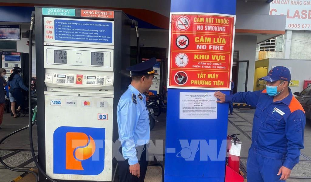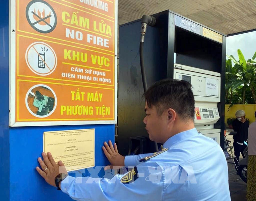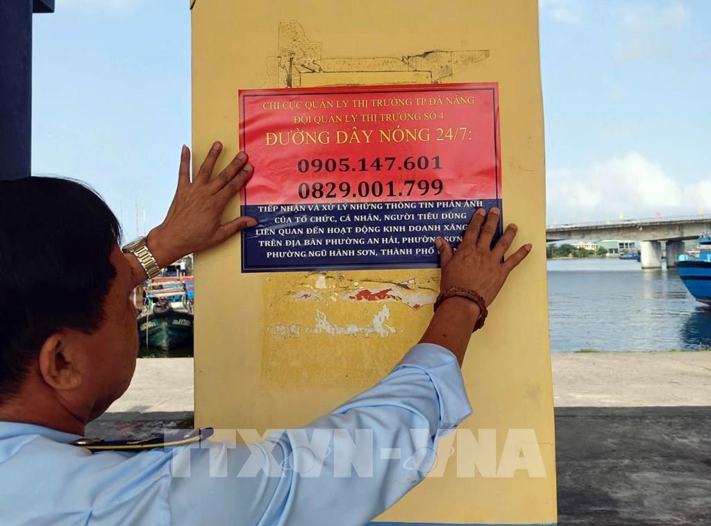Lực lượng quản lý thị trường thành phố Đà Nẵng triển khai dán thông báo số điện thoại đường dây nóng, tại các cửa hàng xăng, dầu. Ảnh: Trần Tĩnh - TTXVN