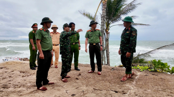 Lãnh đạo Công an TP Đà Nẵng kiểm tra công tác gia cố bờ biển Cửa Đại, đoạn qua phường Hội An Đông (Đà Nẵng) trước khi bão số 13 đổ bộ vào đất liền.
