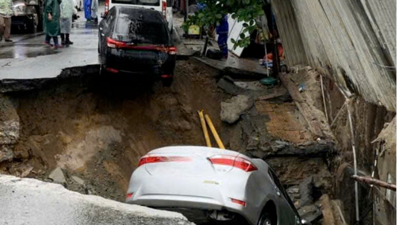 Tại hiện trường, vị trí hố sạt lở nằm sát tường rào bằng tôn của một dự án đang thi công xây dựng. Có hai ô-tô con đang đỗ sát lề đường bị rơi xuống hố, một ô-tô con khác nằm vắt vẻo trên miệng hố.