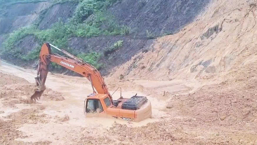 Chiếc xe múc bị đất đá vùi lấp khi đang dọn điểm sạt lở