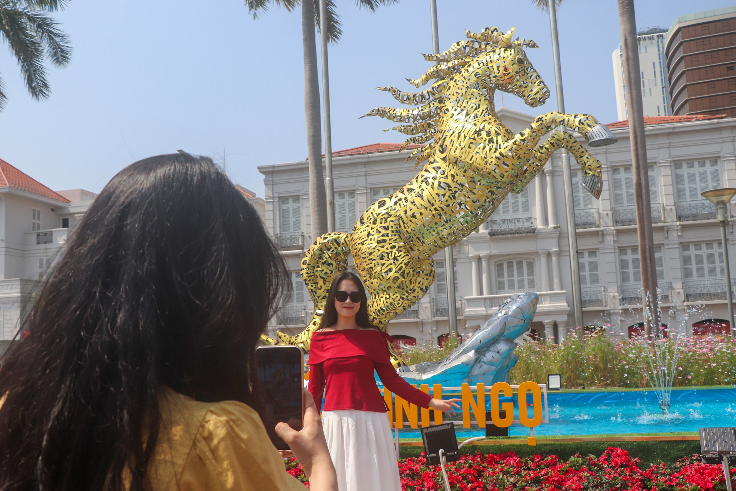 Sáng 22/2 (mùng 6 Tết), đông đảo người dân, du khách check-in tại linh vật Kim Mã hợp nhất ở đường Bạch Đằng, TP Đà Nẵng. Ảnh: Thanh Đức.