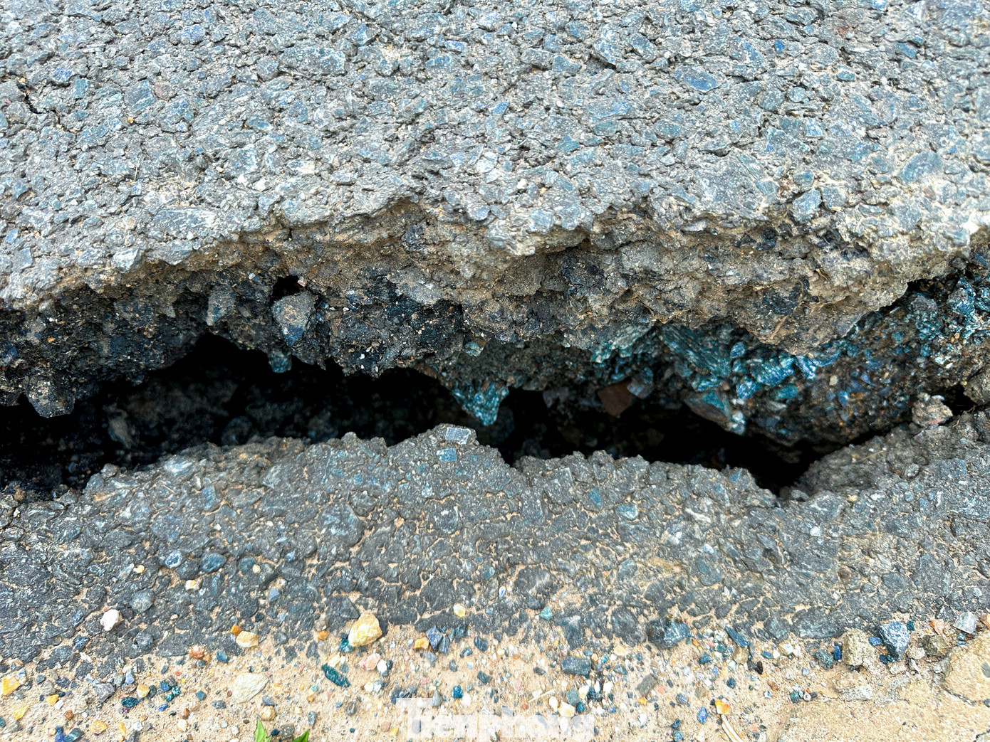 Nhiều đoạn nhựa mặt đường bị bong tróc, tạo thành các rãnh sâu và gồ ghề, gây khó khăn cho việc lưu thông. Một số khu vực có dấu hiệu sạt trượt, tiềm ẩn nguy cơ mất an toàn cho người và phương tiện khi qua lại, đặc biệt là vào ban đêm.