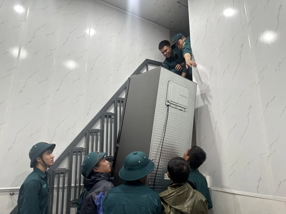 Các vật dụng điện tử như tủ lạnh, máy giặt, máy lọc nước... được di chuyển lên cao. Ảnh: THANH NHẬT
