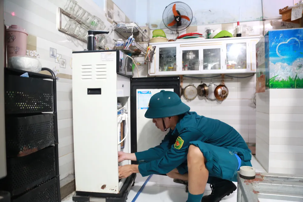 Các thiết bị điện tử như tủ lạnh, máy giặt, máy lọc nước… của người dân được lực lượng dân quân phường Hòa Khánh nhanh chóng kê lên vị trí an toàn, tránh ngập nước.