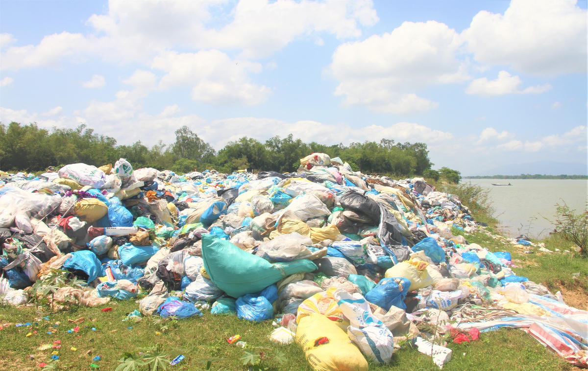 Rác thải chất thành đống lớn nằm ngổn ngang bên dòng sông Thu Bồn. Ảnh: Chí Đại.