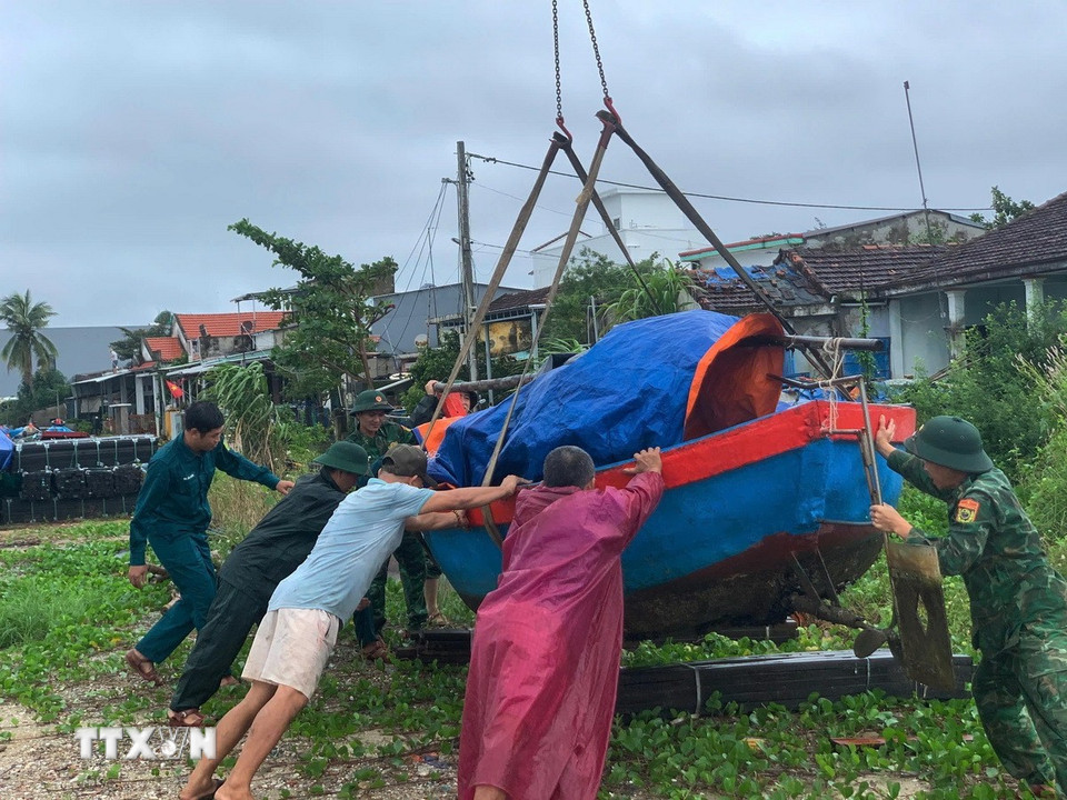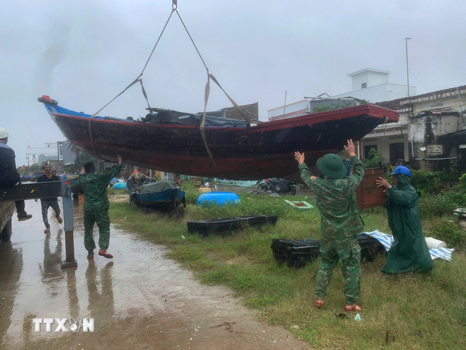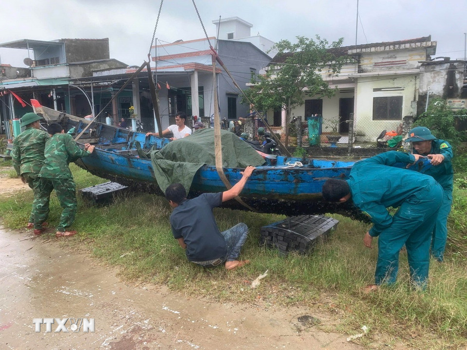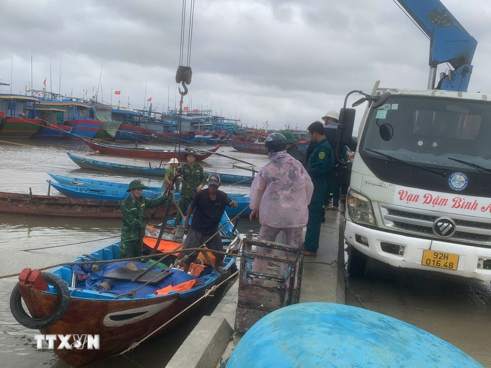 Đến 13h ngày 6/11, toàn bộ ghe thuyền loại nhỏ của ngư dân các xã Núi Thành, Tam Hải đã được các lực lượng vũ trang đưa vào nơi trú ẩn an toàn. (Ảnh: Đoàn Hữu Trung/ TTXVN)