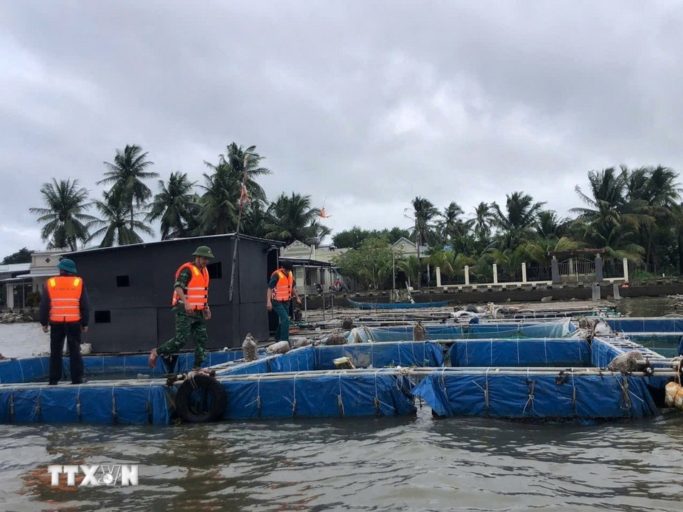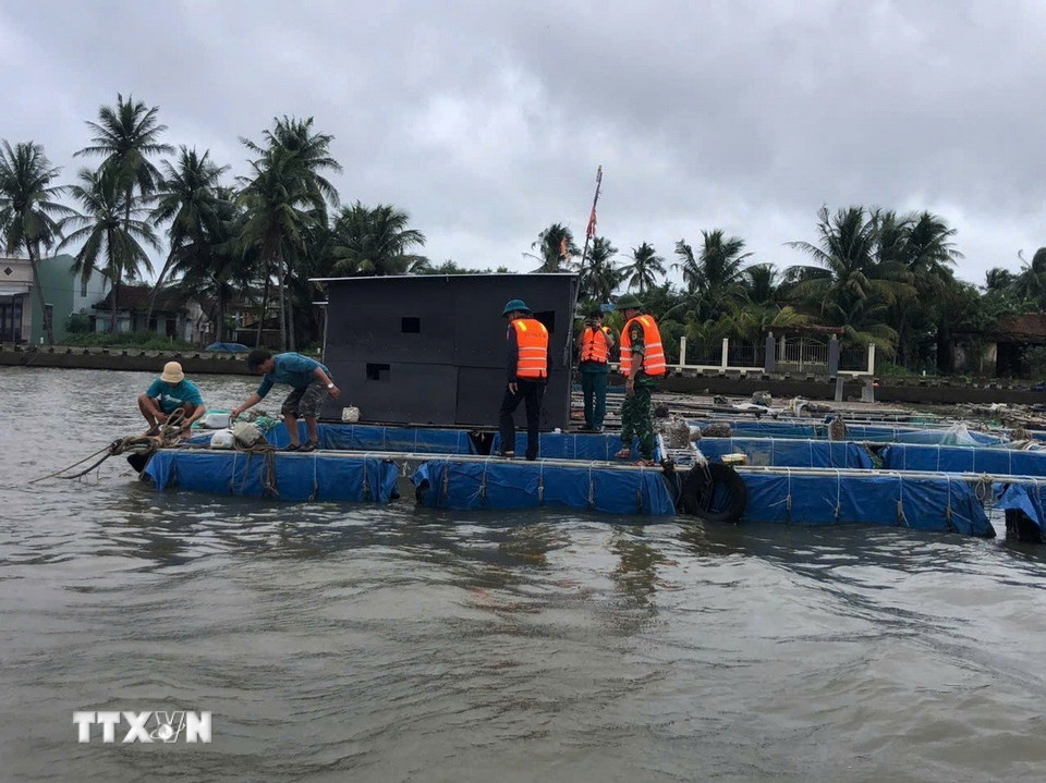 Cán bộ chiến sĩ Đồn biên phòng cửa khẩu cảng Kỳ Hà giúp người dân gia cố lồng bè nuôi trồng thủy sản trên sông. (Ảnh: Đoàn Hữu Trung/TTXVN)