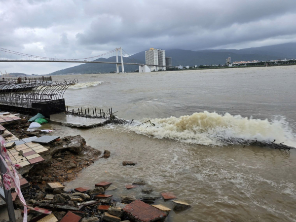 Nước sông Hàn dâng cao kết hợp với sóng lớn liên tục đánh mạnh vào bờ kè đường Như Nguyệt, gây hư hỏng nghiêm trọng nhiều đoạn vỉa hè ven sông.