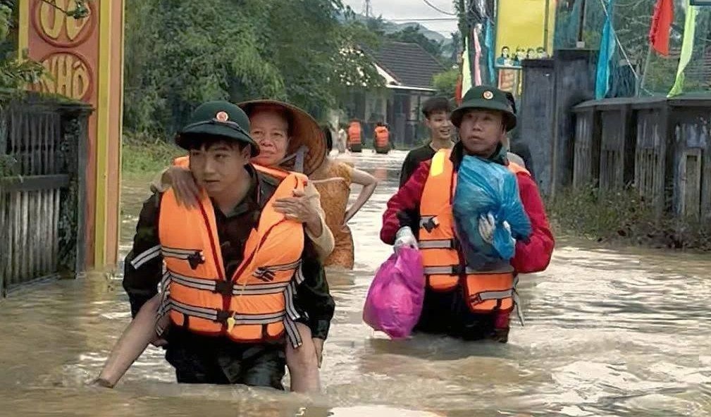 Bộ đội giúp người dân tổ dân phố Hương Lộc, xã Xuân Phú (TP Đà Nẵng) thoát khỏi vùng bị ngập sâu. Ảnh: QK5 cung cấp.
