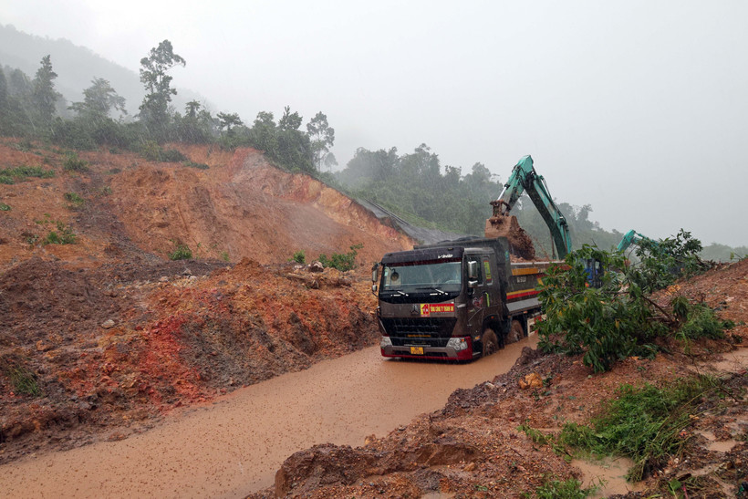 Sáng 28/10/2025, xuất hiện điểm sạt lở mới tại Km46 trên tuyến cao tốc La Sơn-Túy Loan, các lực lượng chức năng đang nỗ lực dọn dẹp khối lượng đất đá rất lớn, sớm khơi thông tuyến. (Ảnh: Đỗ Trưởng/TTXVN)