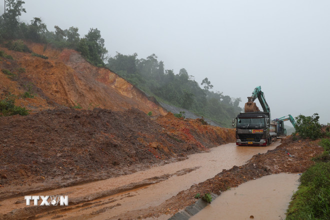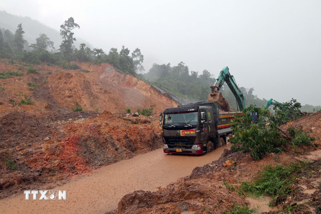 Hiện các lực lượng chức năng đã tổ chức phân luồng giao thông từ xa, cấm các phương tiện lưu thông trên tuyến đường này, đồng thời huy động nhân lực và phương tiện khẩn trương khắc phục để sớm thông tuyến trở lại. (Ảnh: Đỗ Trưởng/TTXVN)