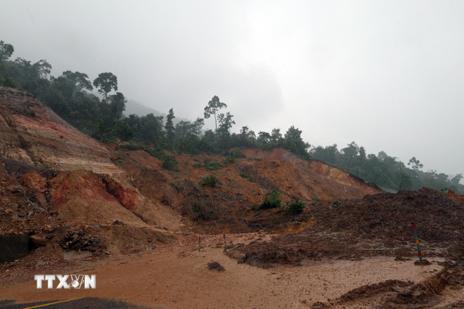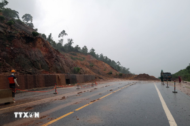 Do ảnh hưởng của đợt mưa lũ lịch sử, trên tuyến cao tốc La Sơn-Túy Loan kết nối thành phố Huế và Đà Nẵng xuất hiện nhiều điểm sạt lở nghiêm trọng, một khối lượng đất đá rất lớn từ trên núi đã tràn xuống mặt đường. (Ảnh: Đỗ Trưởng/TTXVN)