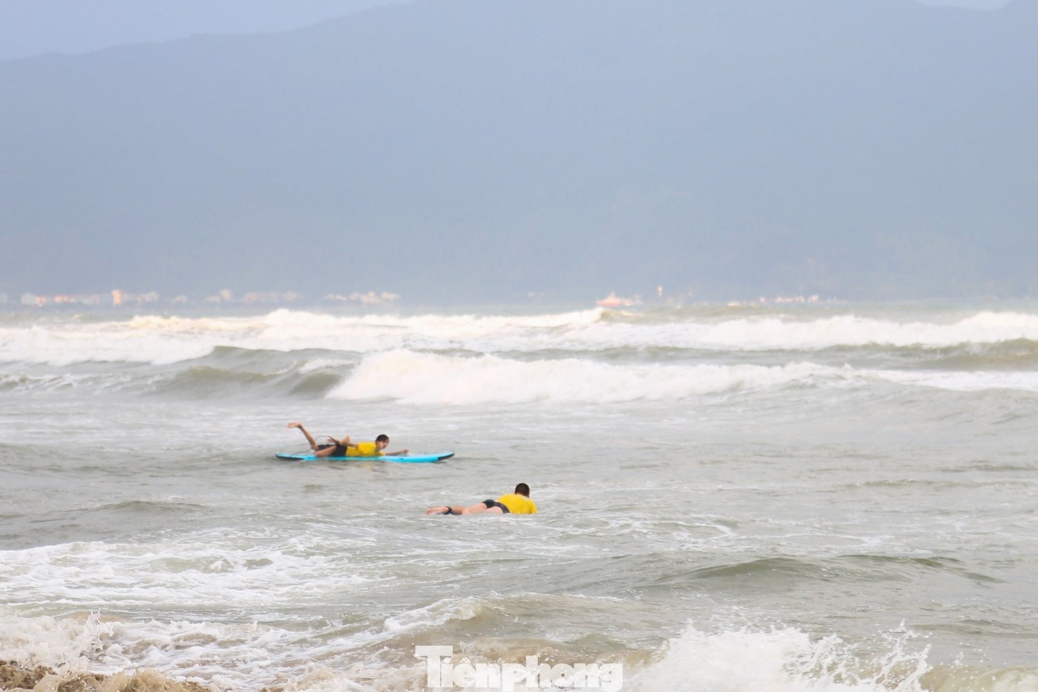 Dù sóng biển tại khu vực miền Trung thời điểm này khá lớn với những đợt sóng cao tấp sát bờ, nhiều du khách vẫn hào hứng tham gia tắm biển và lướt sóng. Không khí nhộn nhịp lan tỏa khắp dải bờ biển phía Đông thành phố.