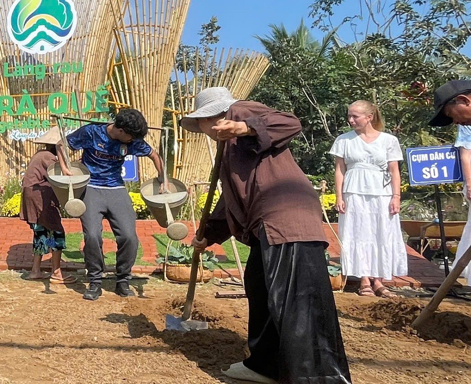 Nhiều du khách phương Tây tham gia hoạt động trồng rau, gánh nước
