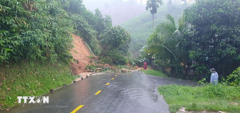 Trên Quốc lộ 40 B, tại khu vực đèo Liêu, mưa lũ đã khiến đất đá và cây cối ở phía ta-luy dương bị sạt lở và ngã đổ xuống mặt đường, khiến giao thông từ đồng bằng lên các xã miền núi gặp nhiều khó khăn. (Ảnh: Đoàn Hữu Trung/TTXVN)