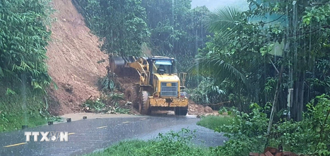 Ban Quản lý dự án đầu tư xây dựng các công trình giao thông tỉnh Quảng Nam đã phối hợp với chính quyền địa phương và lực lượng tại chỗ tiến hành dọn dẹp cây cối ngã đổ, xử lý khẩn cấp lượng bùn đất sạt lở xuống nền đường. (Ảnh: Đoàn Hữu Trung/TTXVN)