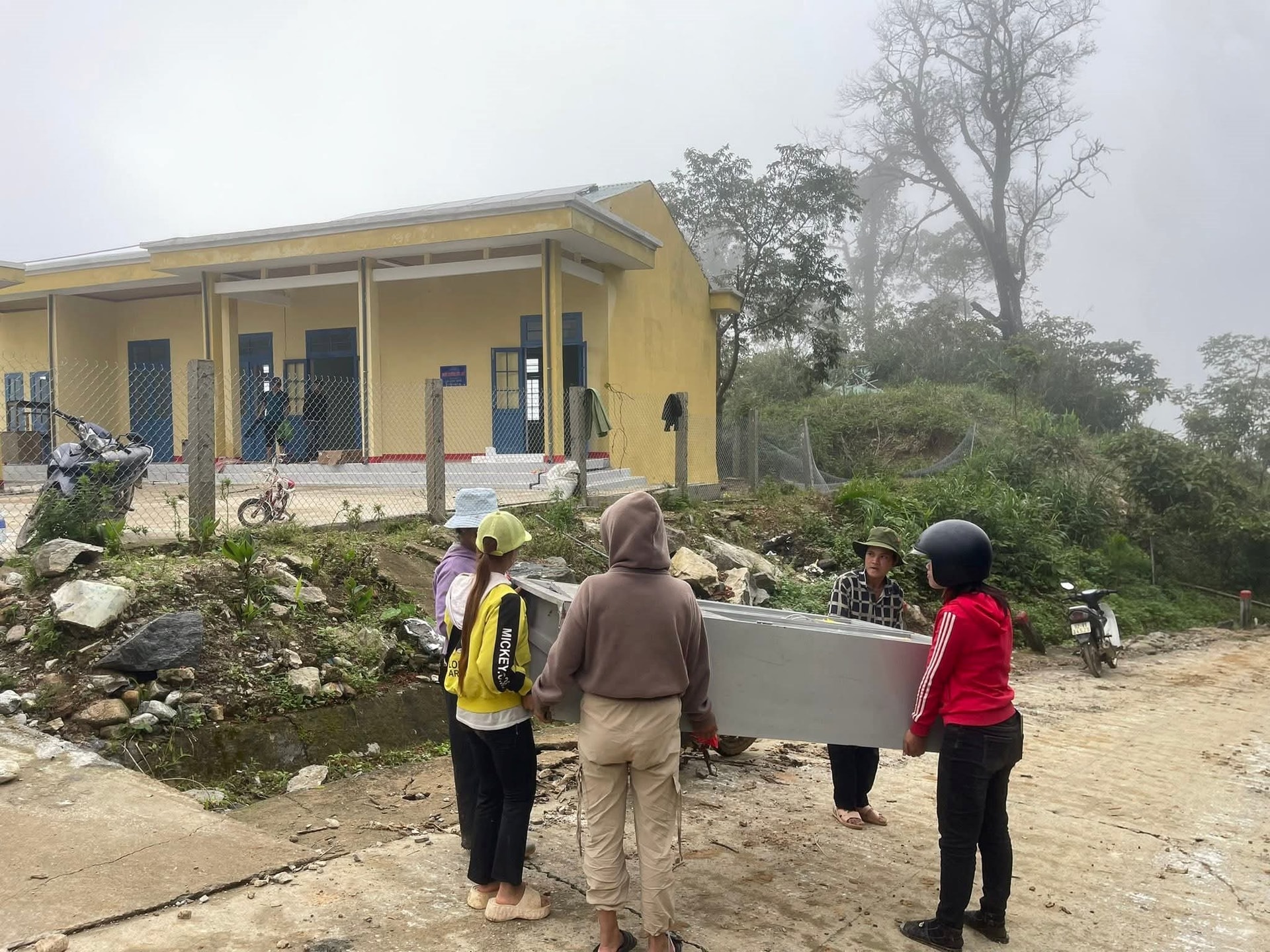 Giáo viên và người dân di dời trang thiết bị khỏi điểm trường Tak Ngo.