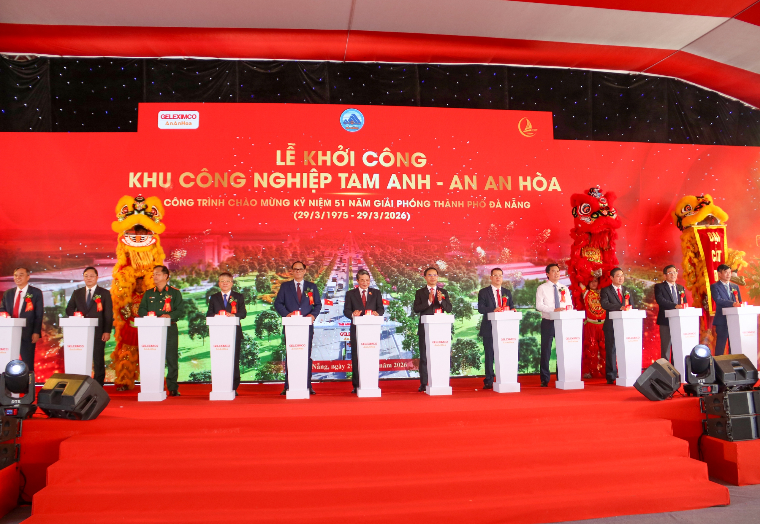 Phó Chủ tịch Quốc hội Nguyễn Đức Hải, Phó Chủ tịch Quốc hội Trần Quang Phương, Thứ trưởng Bộ Xây dựng Nguyễn Tường Văn và các đại biểu bấm nút khởi công dự án.