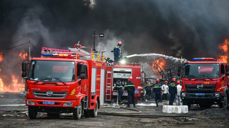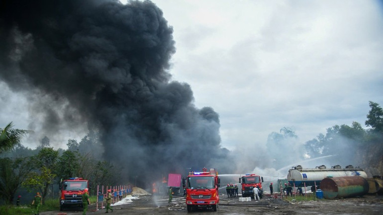 Ngọn lửa bùng phát nhanh, cột khói bốc cao hàng chục mét khiến việc chữa cháy gặp nhiều khó khăn do nhiệt độ cao, khói dày đặc và nguy cơ nổ lớn từ các bồn chứa.