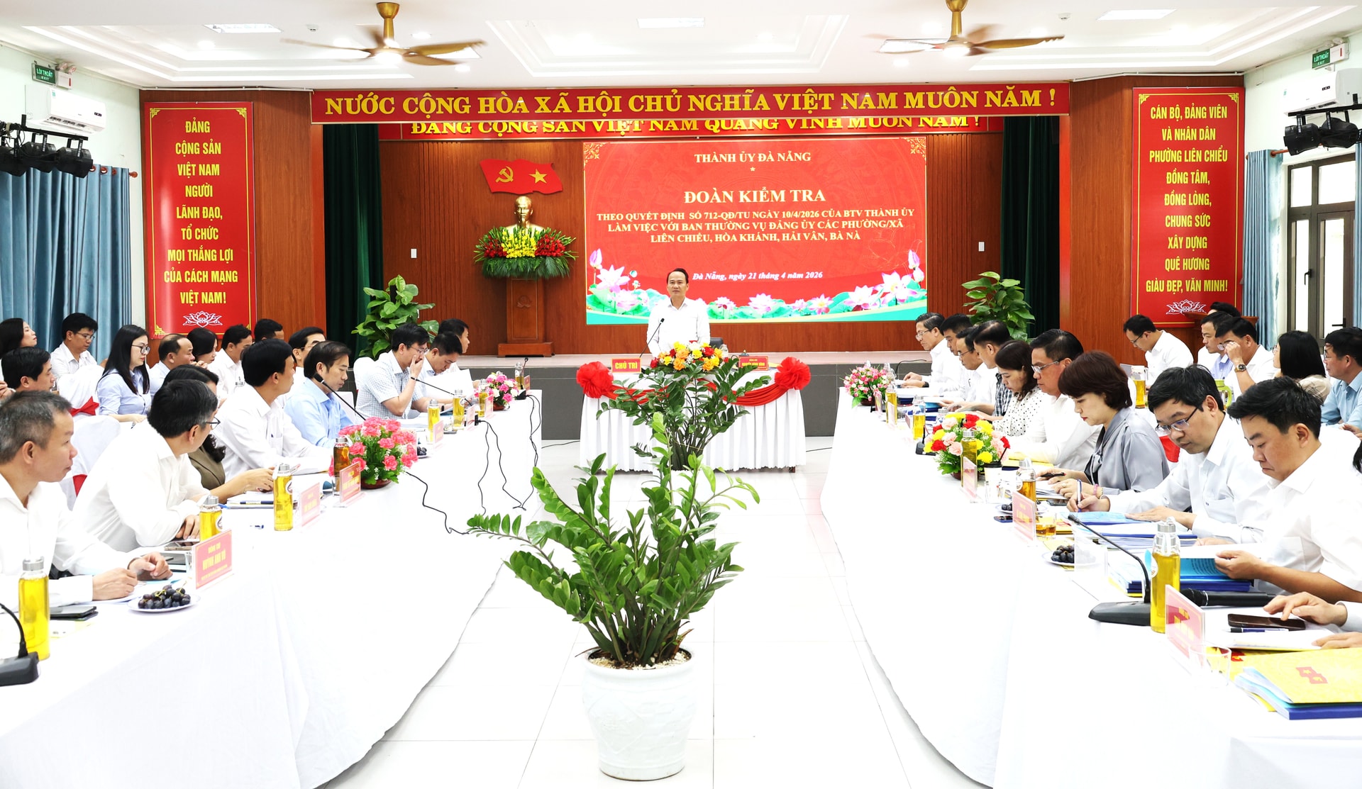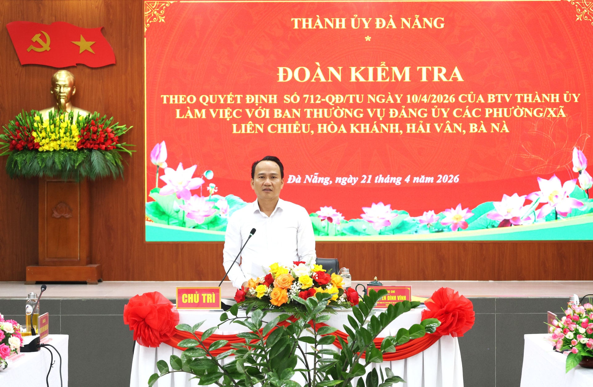 Đoàn kiểm tra theo Quyết định số 712-QĐ/TU ngày 10/4/2026 của Ban Thường vụ Thành ủy, chủ trì làm việc với Ban Thường vụ Đảng ủy 4 xã, phường: Hòa Khánh, Liên Chiểu, Hải Vân, Bà Nà. Ảnh: NGỌC HÀ