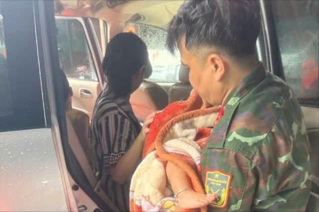Cán bộ quân đội bế cháu bé 8 tháng tuổi bị rơi xuống nước đưa đến bệnh viện kiểm tra sức khỏe.