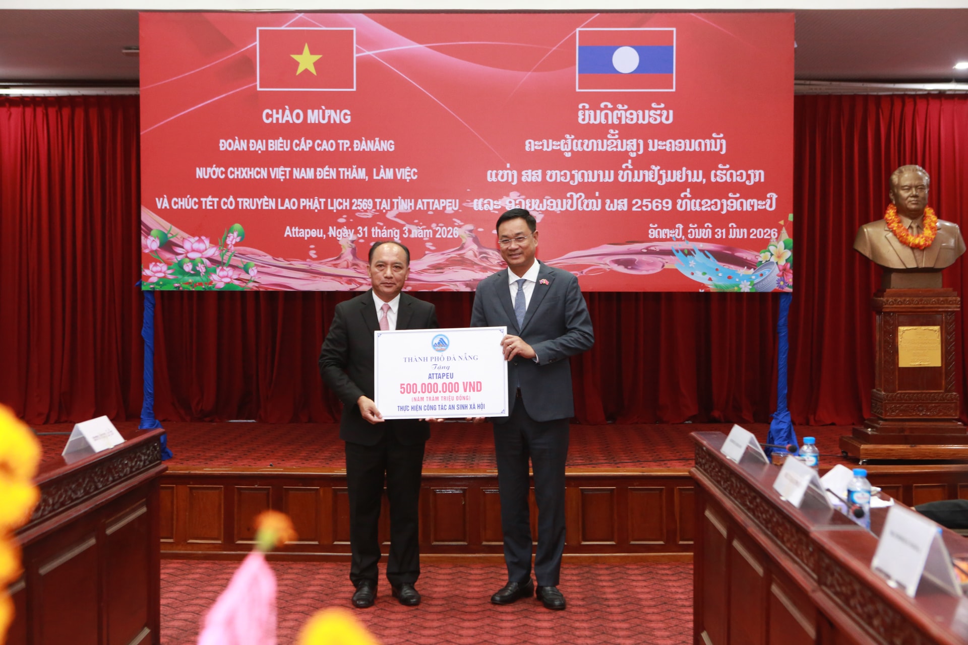 Bí thư Thành ủy Lê Ngọc Quang (bên phải) trao biểu trưng số tiền 500 triệu đồng của thành phố Đà Nẵng tặng tỉnh Attapeu để thực hiện công tác an sinh xã hội. Ảnh: T.CÔNG