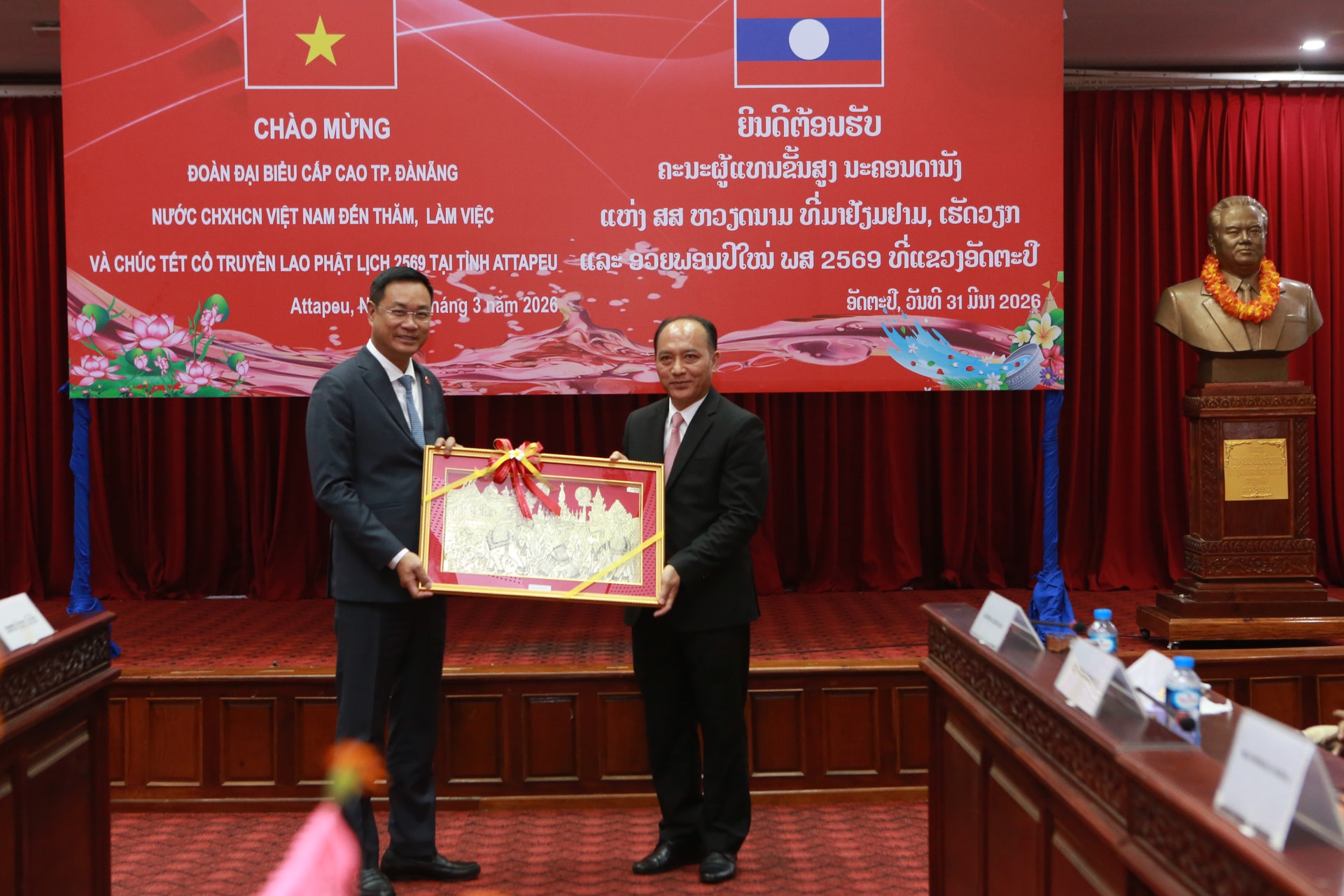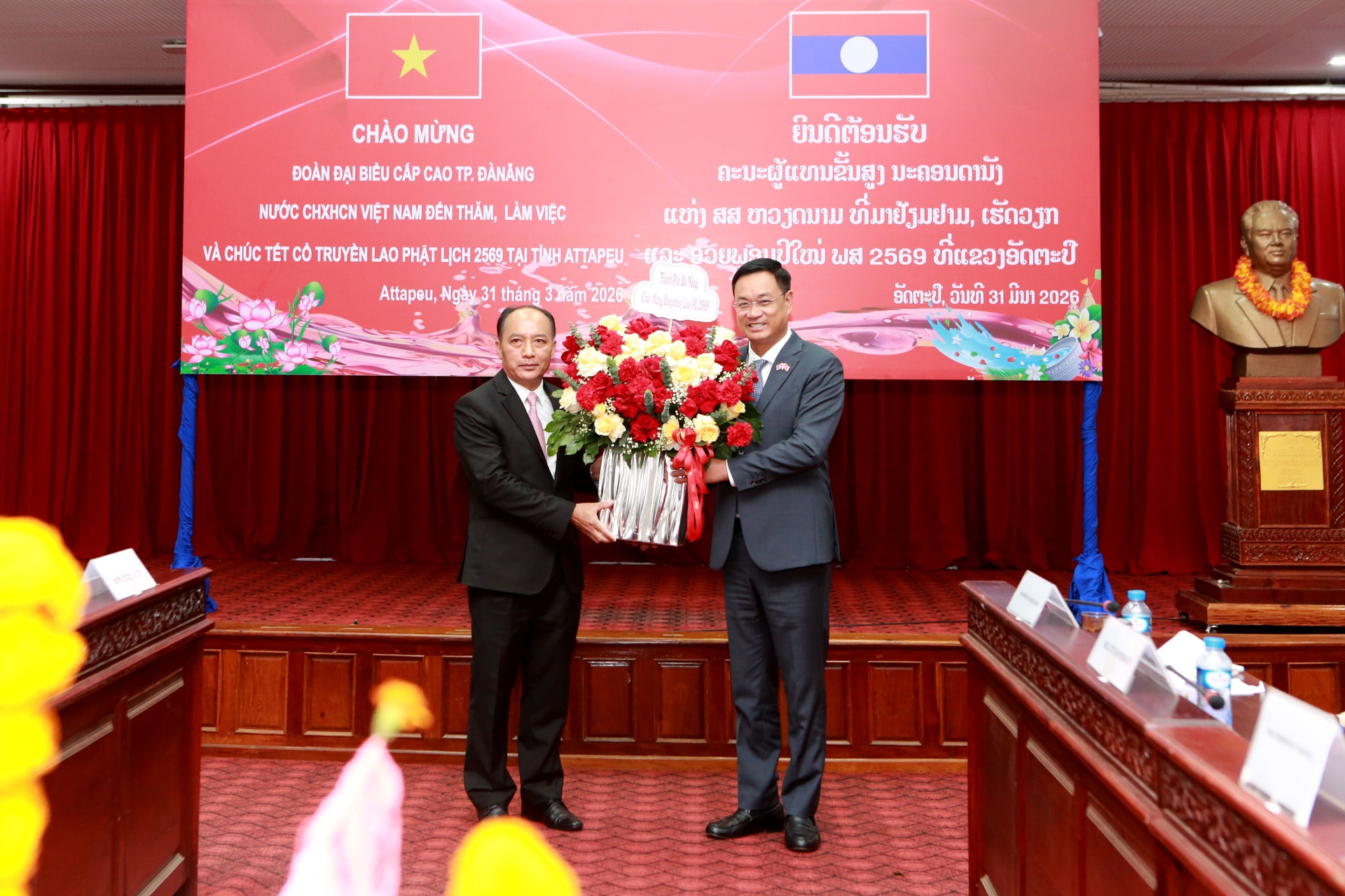 Bí thư Thành ủy Đà Nẵng Lê Ngọc Quang (bên phải) tặng lẵng hoa chúc mừng Tết cổ truyền Bunpimay 2026 cho lãnh đạo tỉnh Attapeu. Ảnh: T.CÔNG