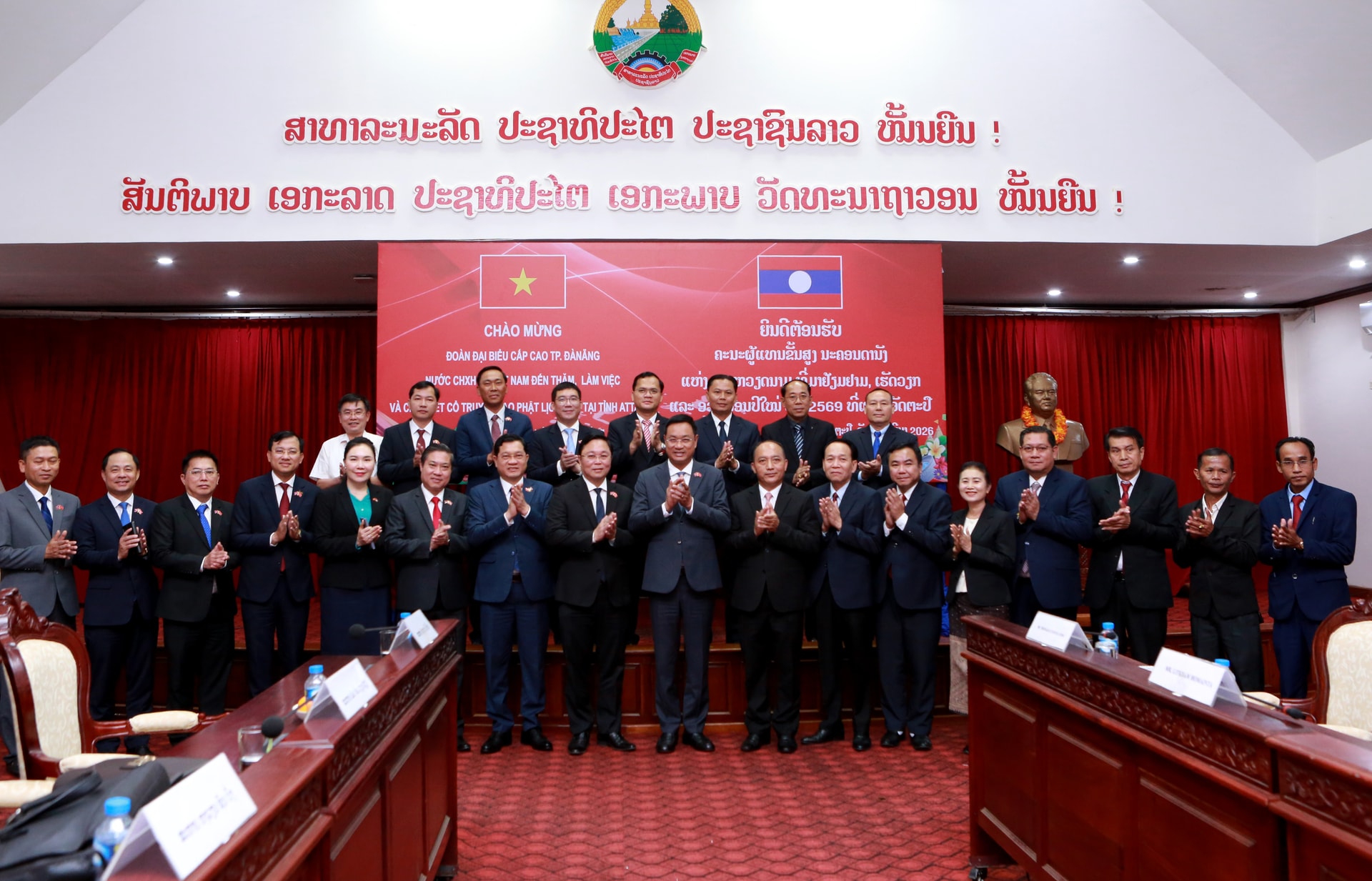 Phát biểu tại buổi gặp mặt, Bí thư Thành ủy Đà Nẵng Lê Ngọc Quang bày tỏ vui mừng khi đến thăm tỉnh Attapeu đúng dịp nhân dân Lào đang hân hoan chuẩn bị đón Tết cổ truyền Bunpimay 2026.