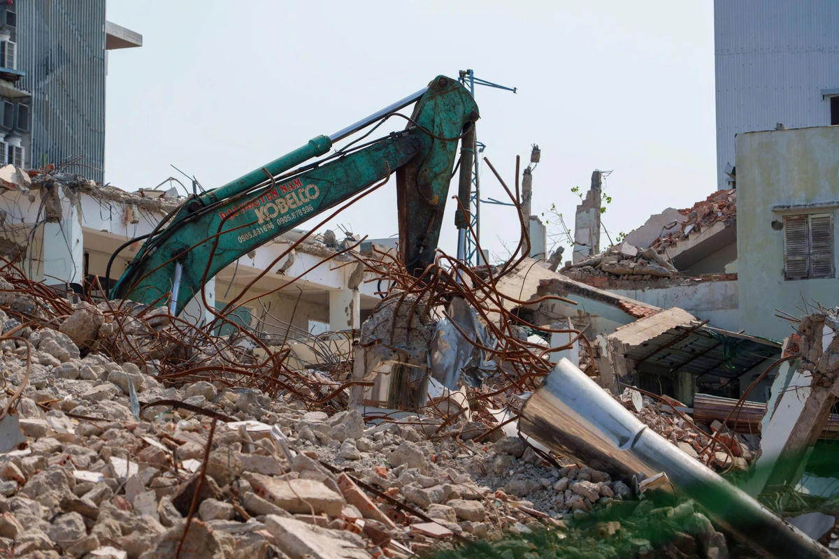 Hiện trường tháo dỡ công trình làm sập nhà dân. Ảnh: Tấn Thành.