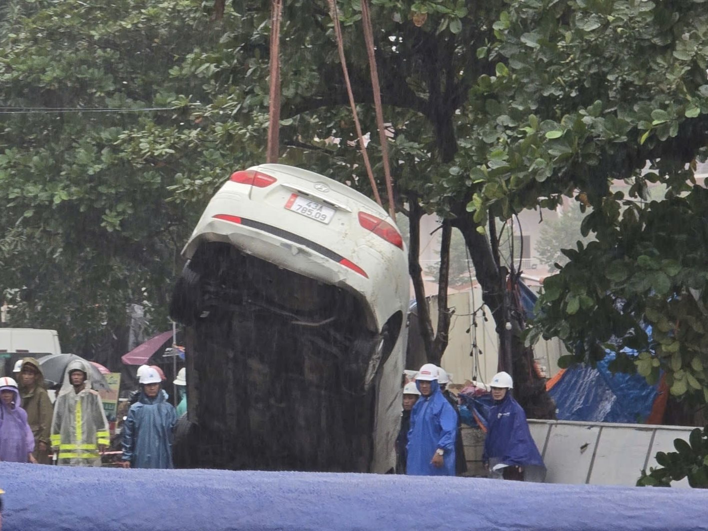 Lực lượng chức năng và đơn vị cứu hộ trục vớt ô tô bị rơi xuống hố sụt trên đường Nguyễn Công Trứ trong chiều 3/12.