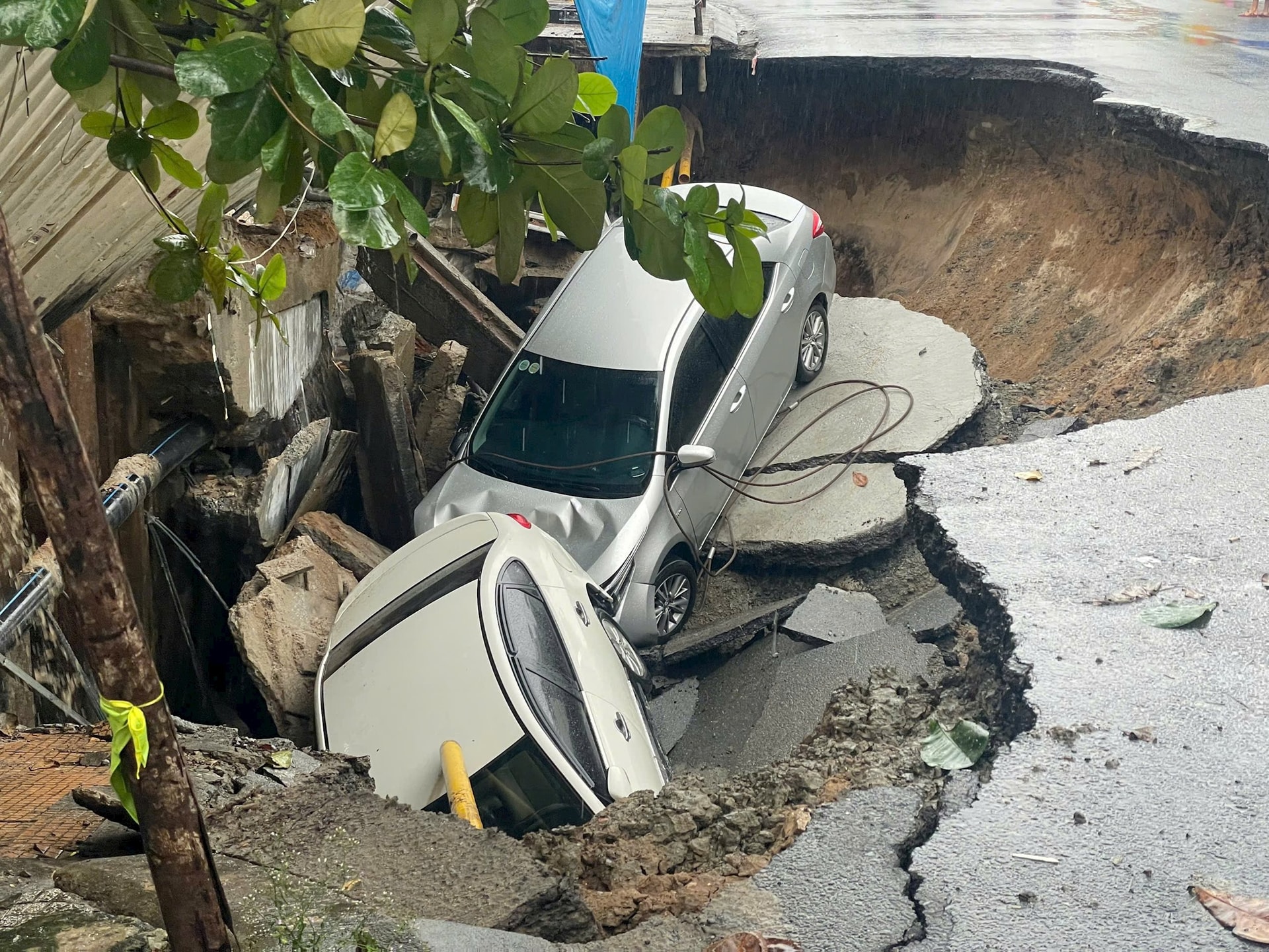 Hiện trường hai xe ôtô bị "hố tử thần" nuốt chửng tại TP Đà Nẵng ngay cạnh công trường đang thi công.