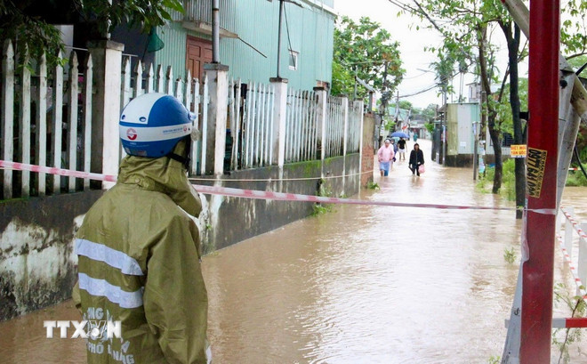 Lực lượng chức năng túc trực và căng dây cảnh báo khu vực ngập nước sâu tại đường Mẹ Suốt. (Ảnh: Trần Lê Lâm/TTXVN)