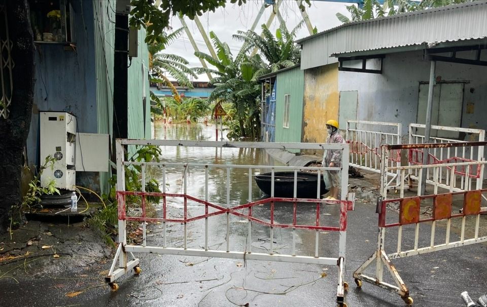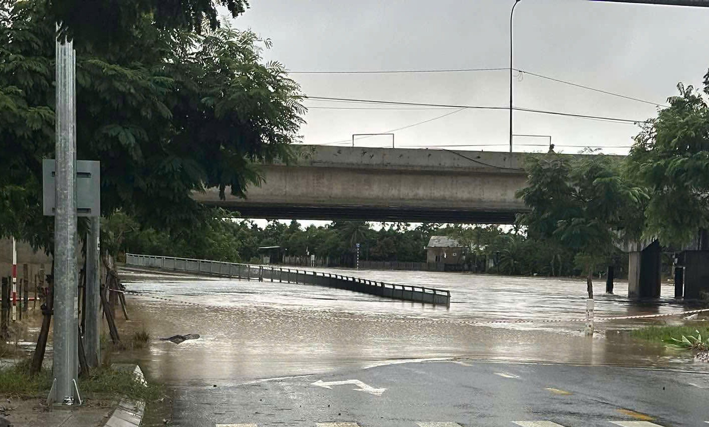 Lực lượng chức năng cảnh báo nước ngập sâu tại gầm đường sắt đường vào thôn Tây An (phường Hòa Xuân). Ảnh: XUÂN QUỲNH