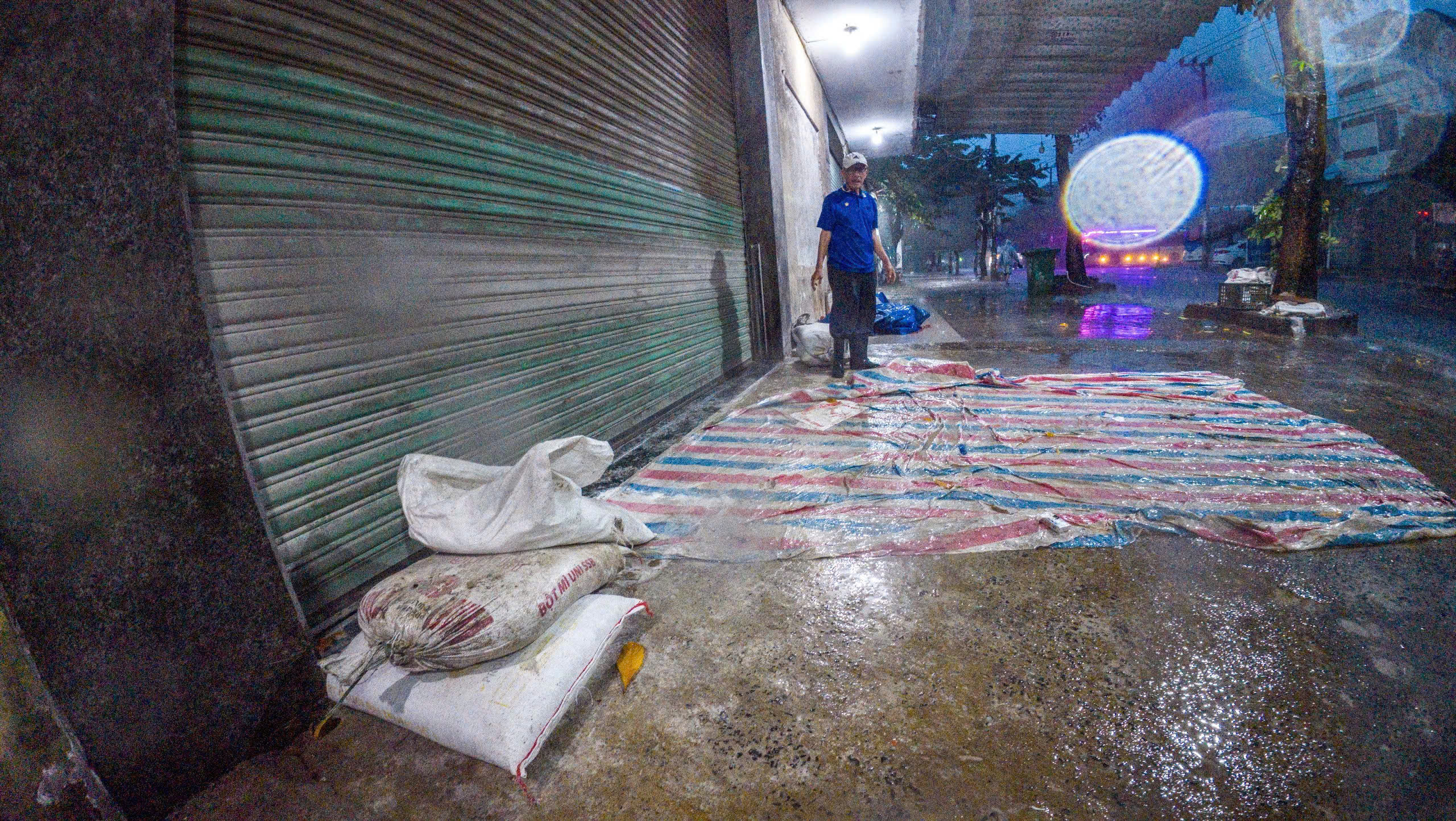 Người dân dùng bao cát chặn không cho nước lũ tràn vào nhà trên đường Tôn Đức Thắng, phường Hòa Khánh nhưng bất lực vì nước lên quá nhanh. Ảnh: PHẠM NGA