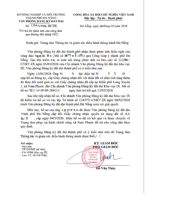 "Đến nay, hồ sơ của ông N.S đã được Văn phòng Đăng ký đất đai TP Đà Nẵng cấp đổi giấy chứng nhận quyền sử dụng đất, cấp ngày 4-3. Hiện hồ sơ đã có kết quả và được chuyển về Trung tâm phục vụ hành chính công xã Nam Phước để trả cho công dân theo quy định" – nội dung trả lời của Sở Nông nghiệp và Môi trường TP Đà Nẵng nêu.