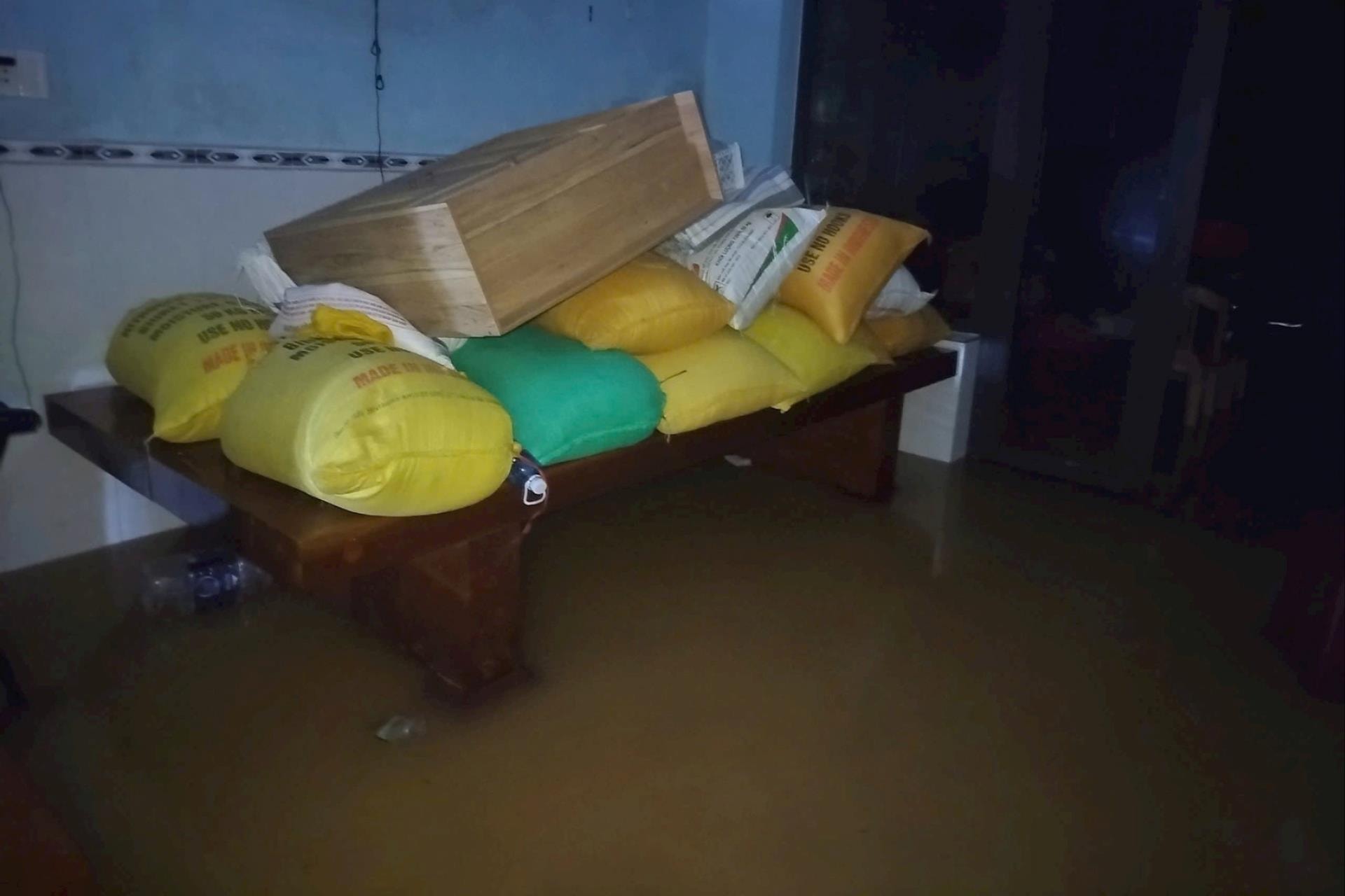 Để bảo vệ tài sản, người dân kê bao lúa và đồ đạc lên cao.