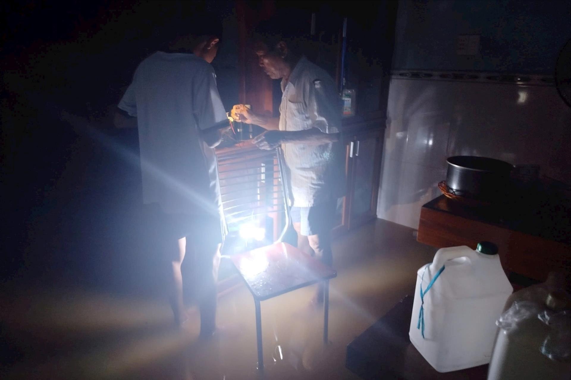 Mất điện, hai ông cháu soi đèn pin thu xếp lại đồ dùng trong căn nhà ngập nước.