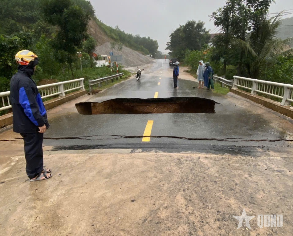 Do mưa lớn, cầu Ca Da thuộc Quốc lộ 24C bị sụp hố đầu cầu.