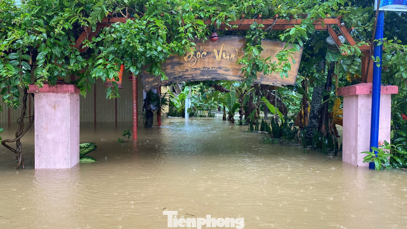 Nhiều nhà dân, quán cà phê và cửa hàng buôn bán trong thôn bị ngập sâu, bàn ghế, đồ đạc được người dân kê cao để tránh hư hỏng.