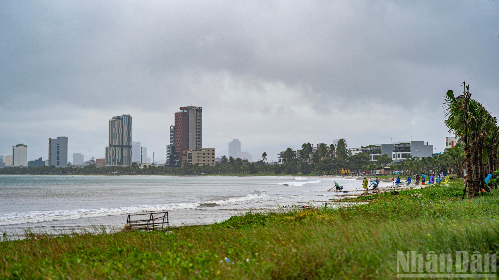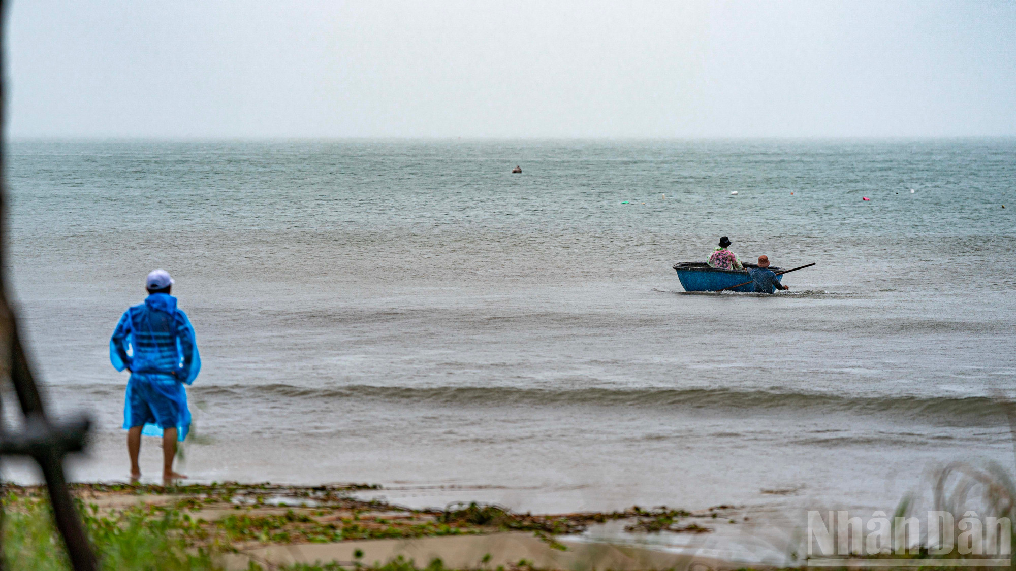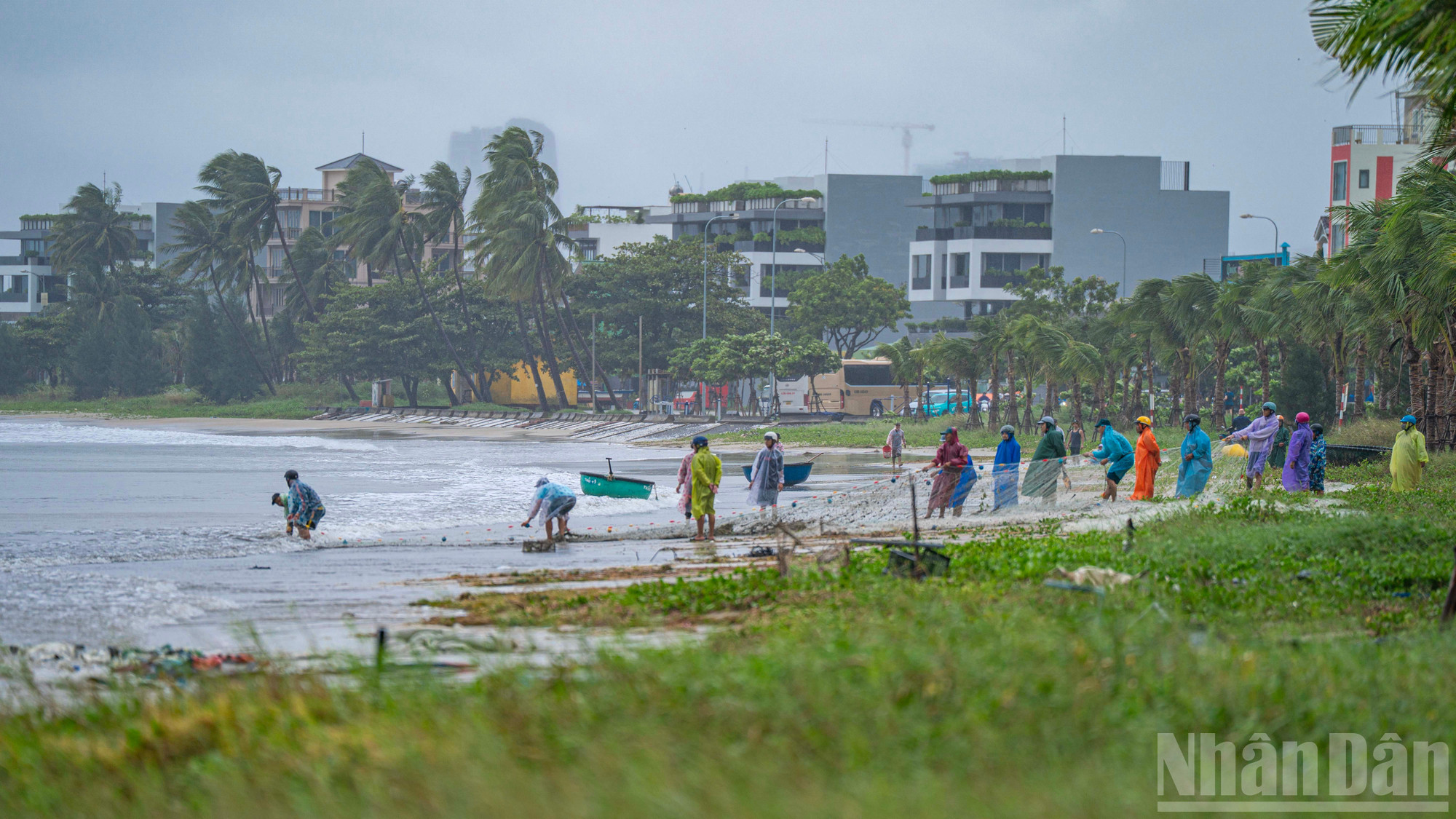 Một số người dân tham gia kéo lưới ở khu vực gần bờ trong cơn mưa.