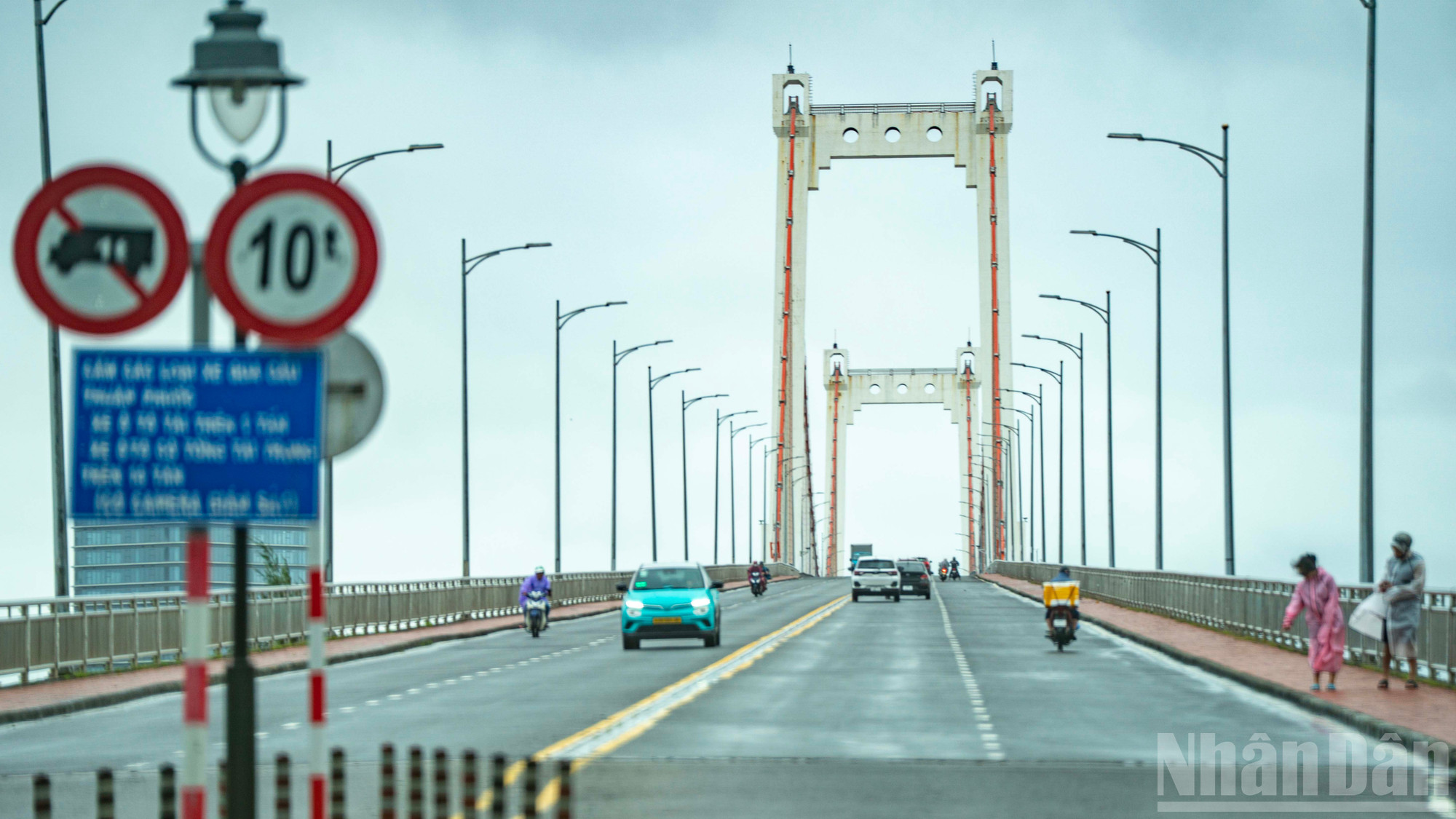 Trên cầu Thuận Phước mưa dày và gió, nhiều ô tô đã chủ động đi chậm để che chắn cho người đi xe máy có thể di chuyển dễ dàng hơn.